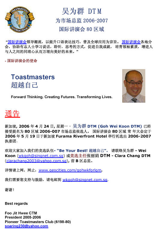 an email to Wei Koon (wkgoh@singnet.com.sg) or to Campaign Director, Clara Chang